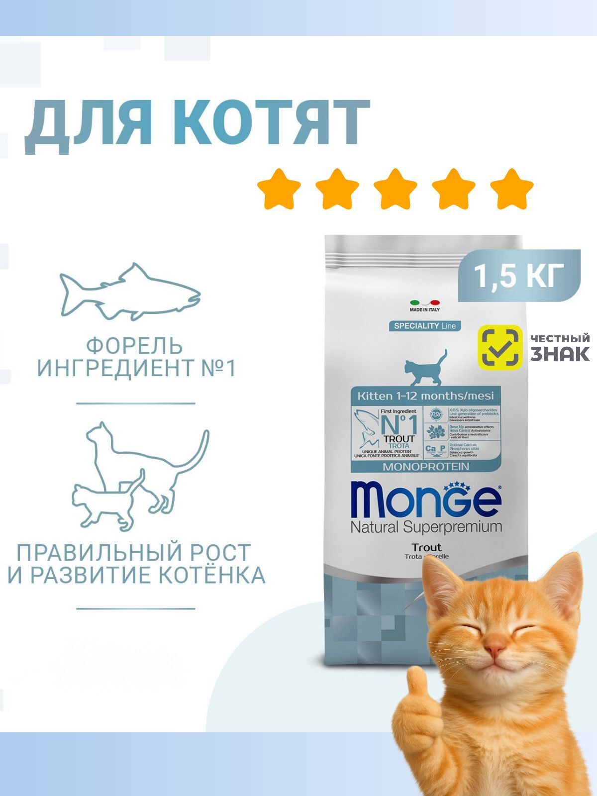 Сухой корм Monge Natural Superpremium Monoprotein Kitten Duck 1,5 кг (артикул 70011099) – гипоаллергенный монобелковый рацион для здоровья и развития.