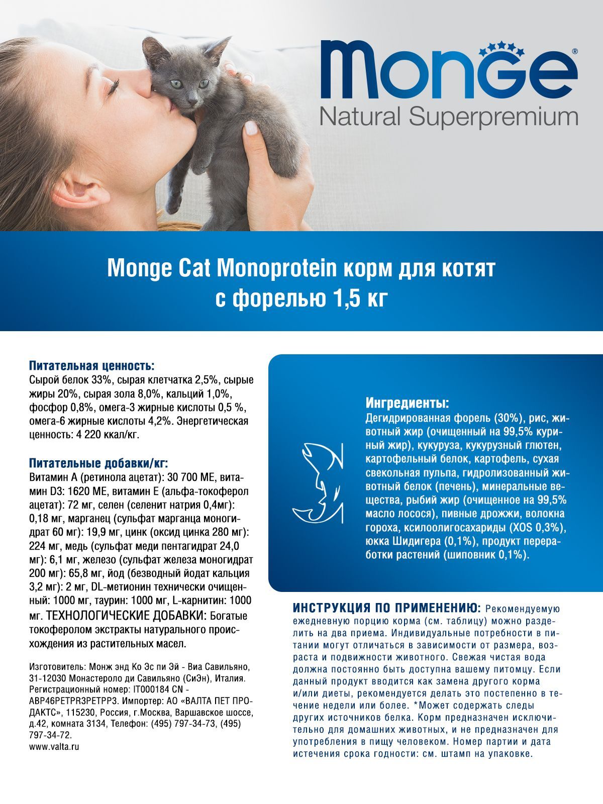 Состав корма полностью безопасен: он не содержит ГМО, искусственных красителей и консервантов. Произведенный в Италии, корм Monge Monoprotein с уткой обеспечит вашего котенка всем необходимым для здорового старта в жизни.