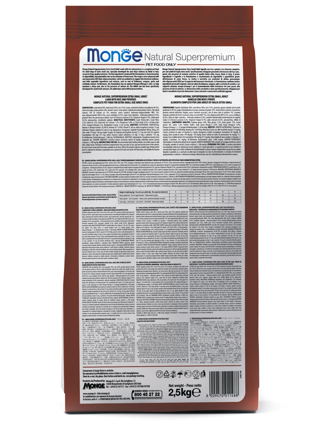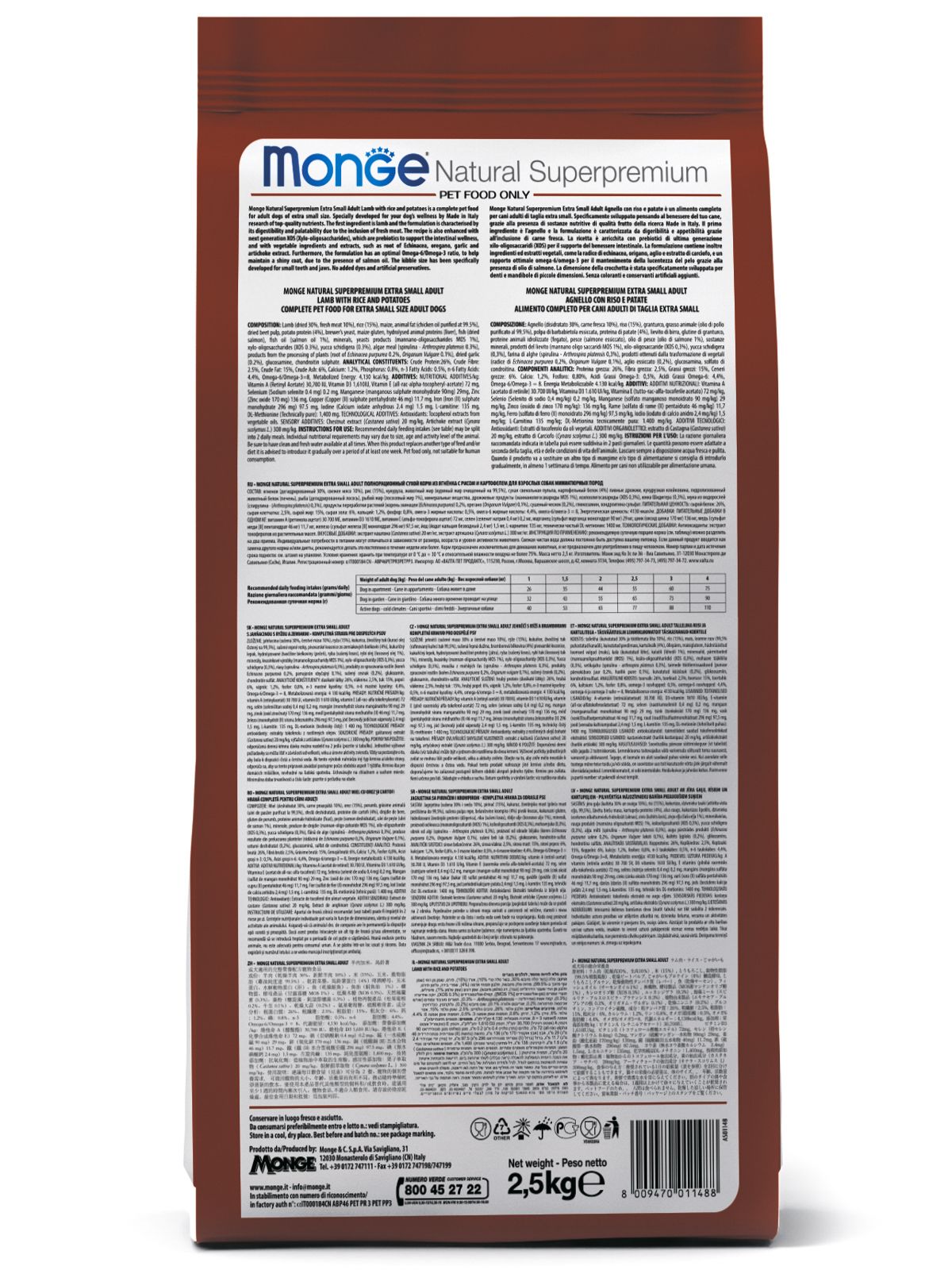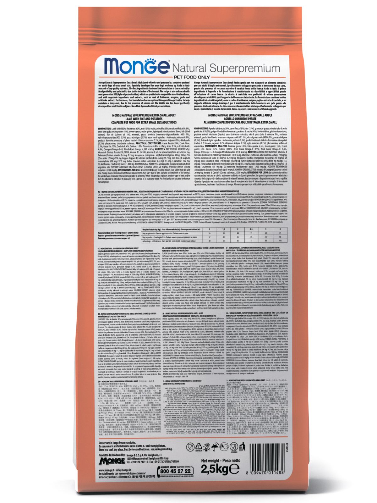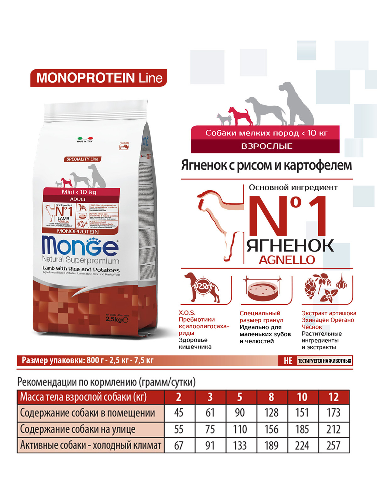 Сухой корм Monge Natural Superpremium Mini Puppy and Junior Monoprotein Lamb with Rice 2,5 кг (артикул 70011525) – это гипоаллергенный монобелковый рацион супер-премиум класса. Корм создан специально для щенков мелких пород в возрасте от 2 до 12 месяцев с чувствительным пищеварением и склонностью к аллергии. В основе формулы – единственный источник животного белка – мясо ягненка, что сводит к минимуму риски пищевых реакций и идеально подходит для исключающей диеты.