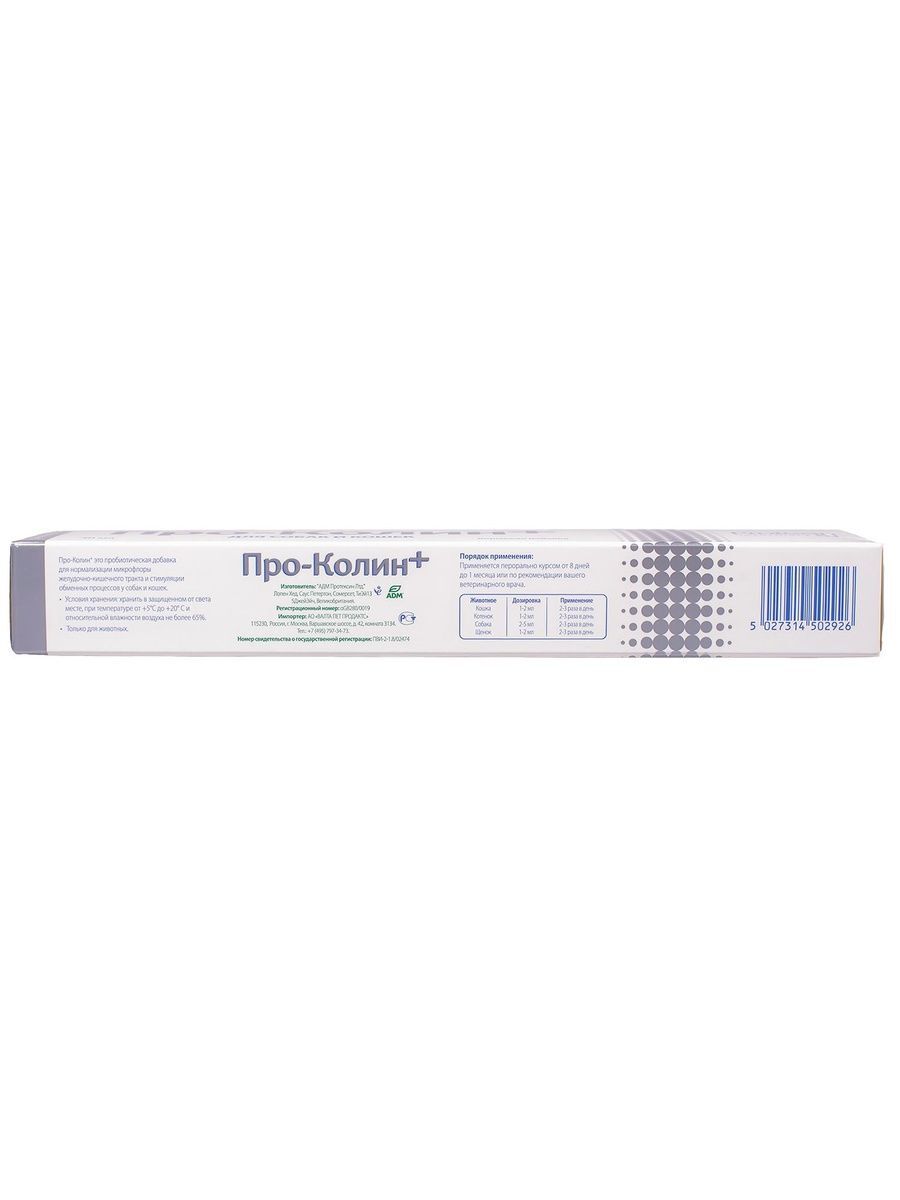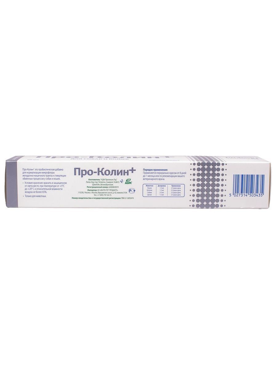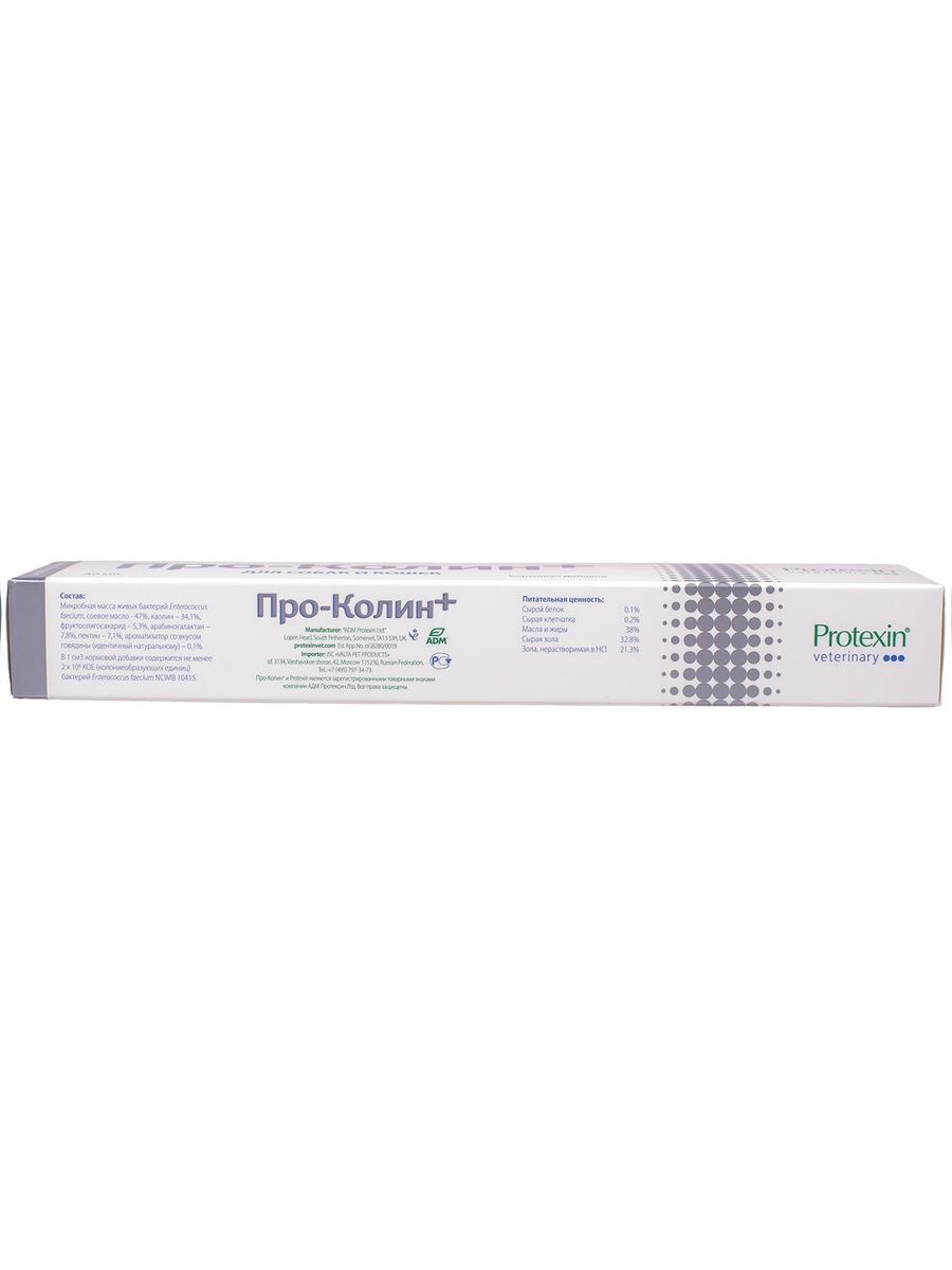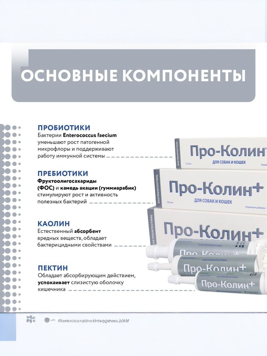 Про-Колин+® – пробиотическая паста для собак и кошек, быстро нормализующая работу ЖКТ и микрофлору при диарее и расстройствах. Это средство №1 в Великобритании для лечения диареи у животных. Формула двойного действия сочетает пробиотик (Enterococcus faecium) для заселения кишечника полезными бактериями и пребиотик (FOS и акация) для их активного роста. Каолин и пектин действуют как природные абсорбенты, выводя токсины и успокаивая воспаленную слизистую.