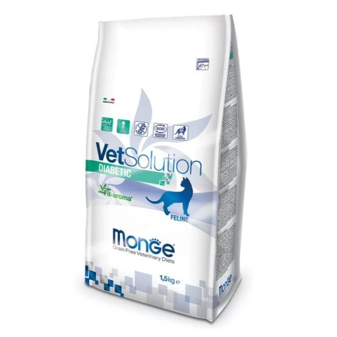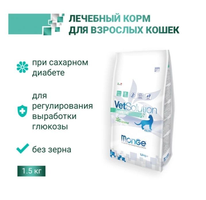 Лечебный корм Monge (Монж) VetSolution Cat Diabetic для кошек при сахарном диабете и избыточном весе 1,5 кг.Monge VetSolution Diabetic — полнорационный сухой диетический корм из курицы для кошек «Diabetic» для контроля поступления глюкозы (при сахарном диабете) у кошек.Разработан с целью профилактики набора избыточной массы тела и нарушения обмена веществ, а так же для питания животных, страдающих диабетом.Содержит концентрат сока дыни для нейтрализации свободных радикалов.Fit-aroma - семена подорожника для регулирования процессов всасывания в кишечнике.Ксилоолигосахариды (XOS) для защиты кишечной микробиоты.Формула характеризуется низким уровнем моно- и дисахридов.