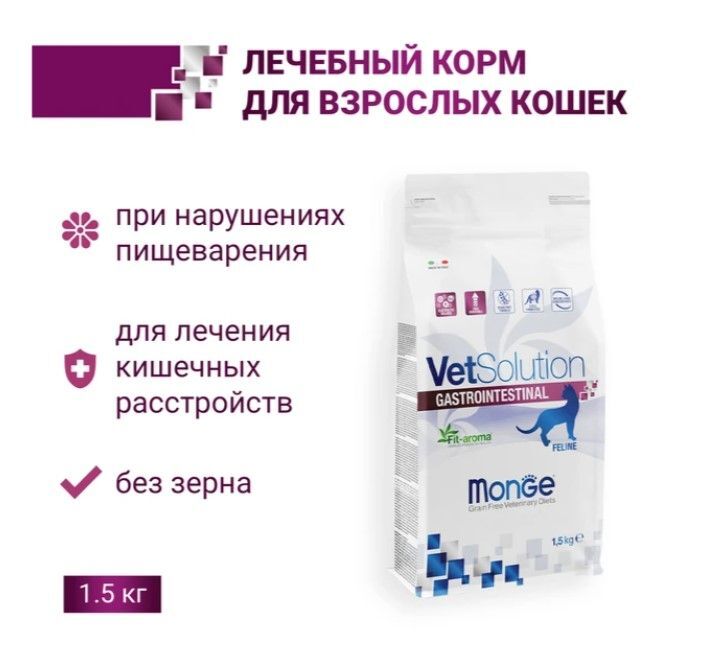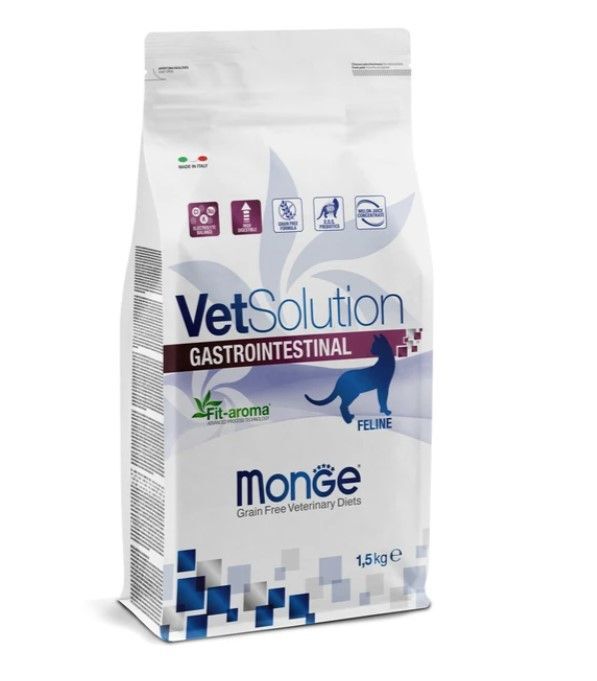 Лечебный корм Monge (Монж) VetSolution Cat Gastrointestinal Гастро интестинал для кошек при заболеваниях желудочно-кишечного тракта, таких как гастрит, колит, острый и хронический гастроэнтерит, диарея и избыточный бактериальный рост в тонком отделе кишечника 1,5 кг.Monge VetSolution Gastrointestinal — полнорационный сухой диетический корм из свинины для кошек «Gastrointestinal » для устранения симптомов расстройства пищеварения у кошек.Содержит концентрат сока дыни для нейтрализации свободных радикалов.Fit-aroma - конский каштан для поддержки здоровья кишечника.Ксилоолигосахариды (XOS) для защиты микробиоты кишечника и повышенный уровень натрия и калия и легкоусвояемых ингредиентов.